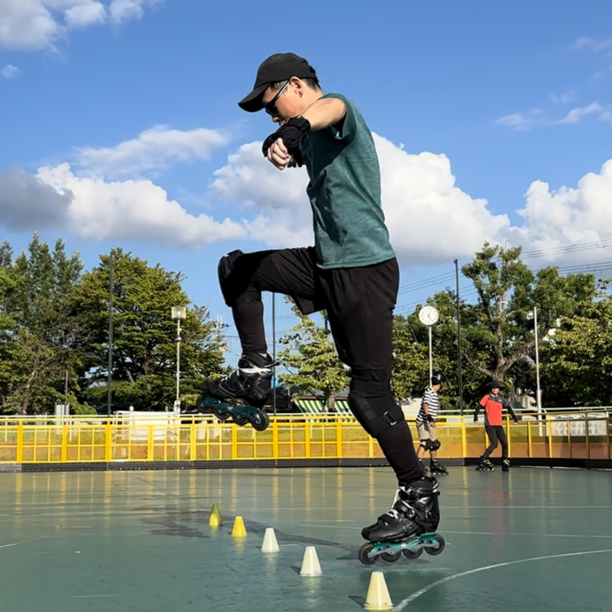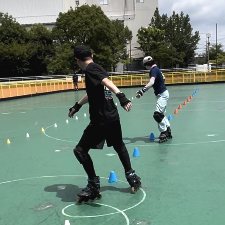 フリースタイル(インラインスケート)は、主に「クラシックスラローム」「バトルスラローム」「スピードスラローム」「ペアクラシックスラローム」「スライド」「フリージャンプ」の6種目で構成されています。 中でも代表的な「クラシックスラローム」は、等間隔(50cm×20個、80cm×20個、120cm×14個)に並べられたミニパイロン(コーン)の間を、音楽に合わせて華麗な技を繰り出しながら滑る種目として知られています。