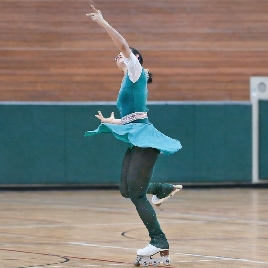 アイススケートのフィギアの靴に前方にブレーキがついたブレードがついているブーツを履いて、スピン、ジャンプ、ステップなどを表現します。技術的にはアイスのフィギュアスケートと似ている競技ですが氷上リンクを必要とせず当リンクやホールや体育館での連勝が可能です。